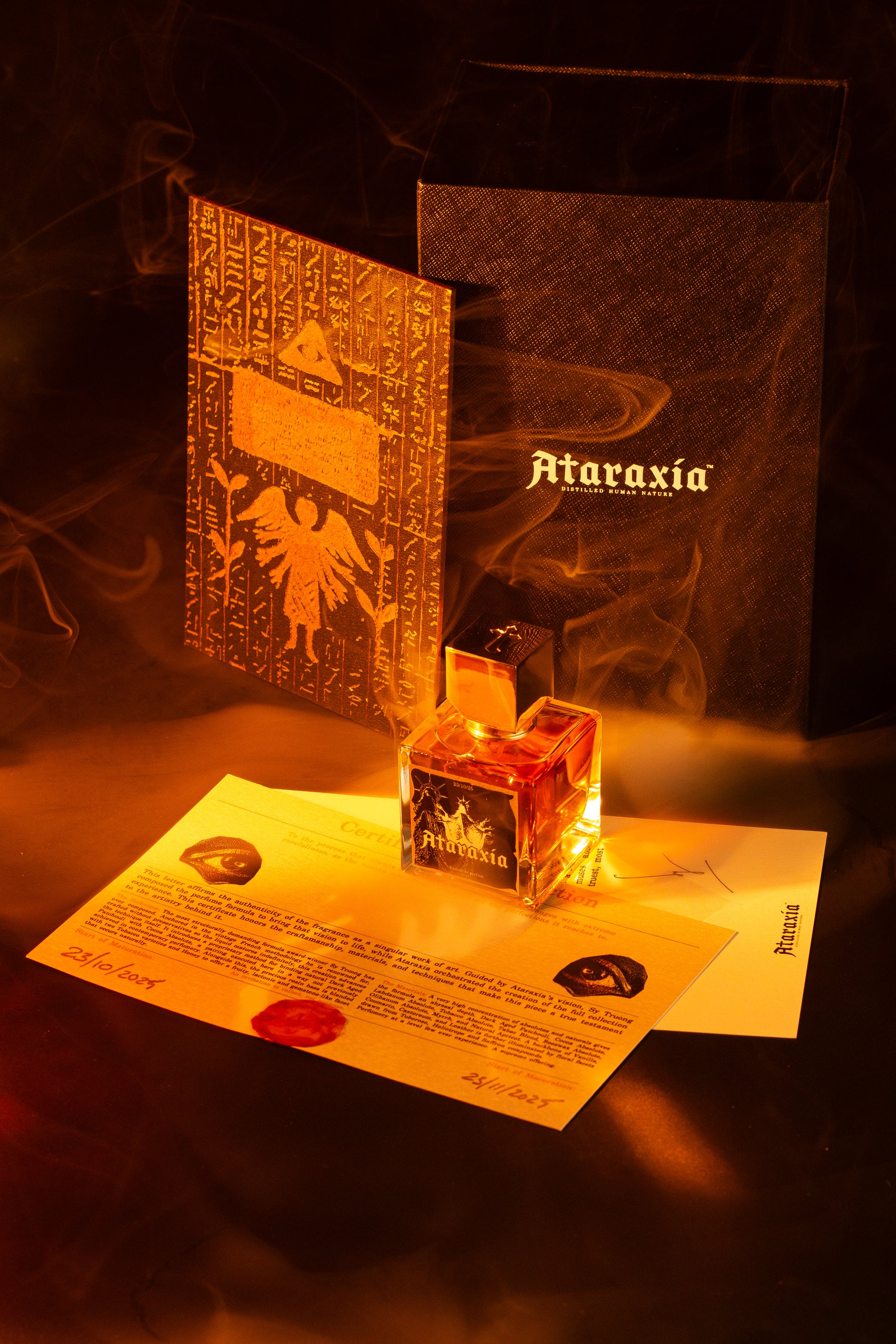 Presented in Ataraxia's new magnetic collector's box, accompanied by an original naturally resinous wood plaque that has been drawn with pyrography and a signed, sealed certificate of authenticity detailing the official Deity dates of maceration and maturation for this exclusive batch + more. Each label bears the date of maceration.